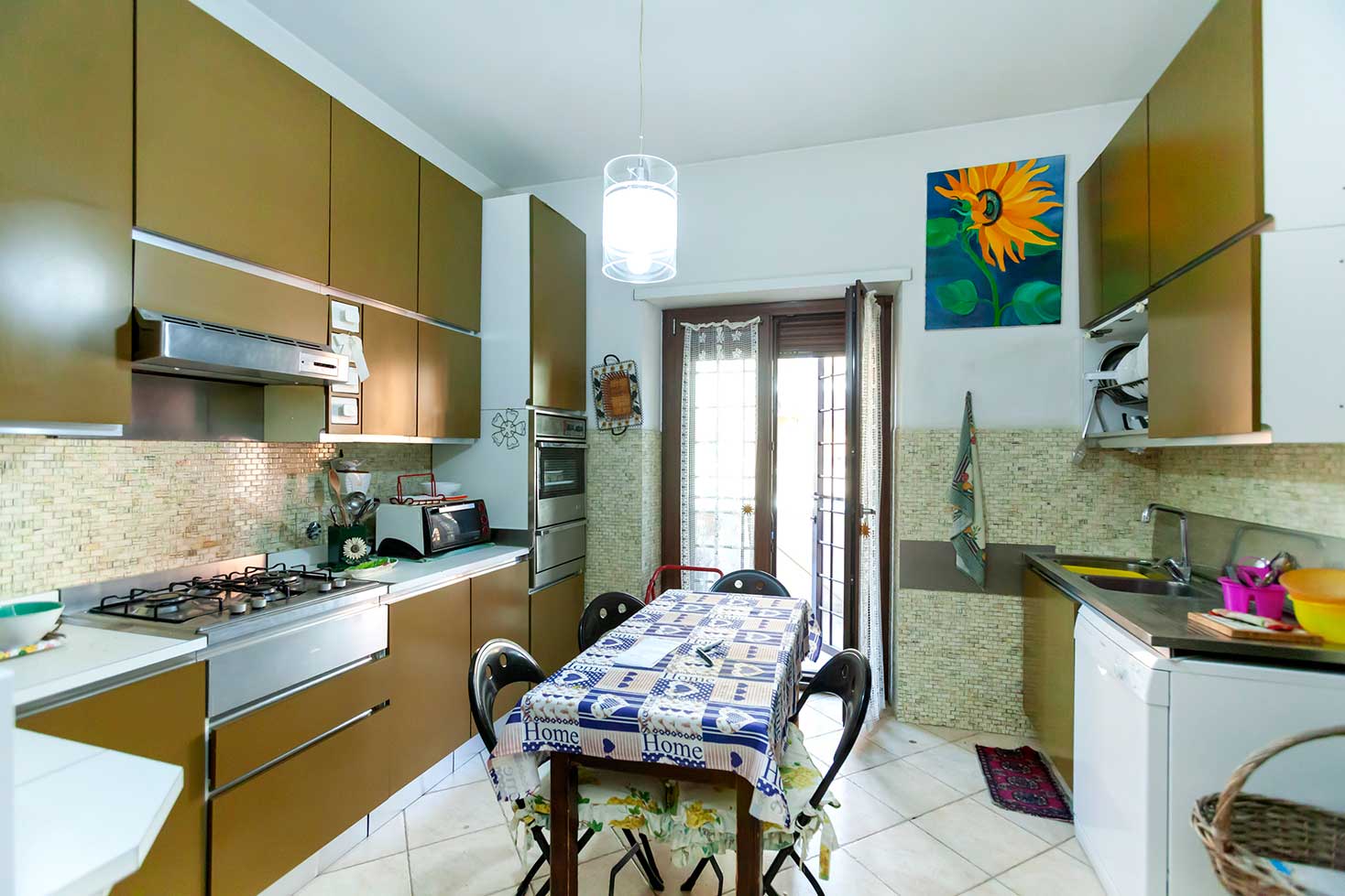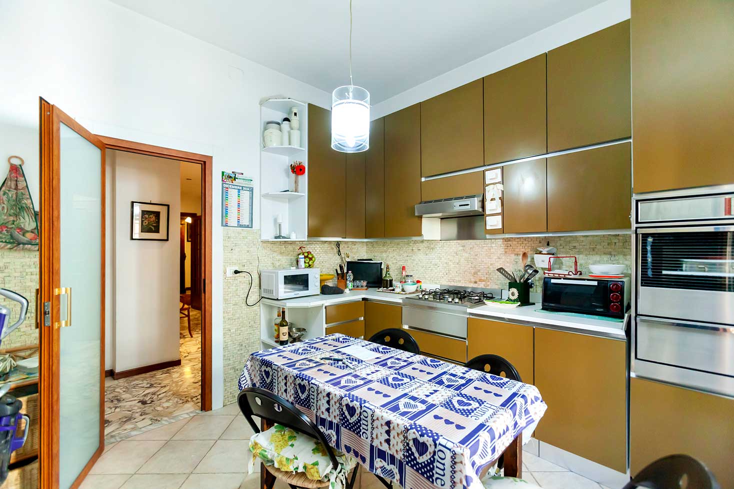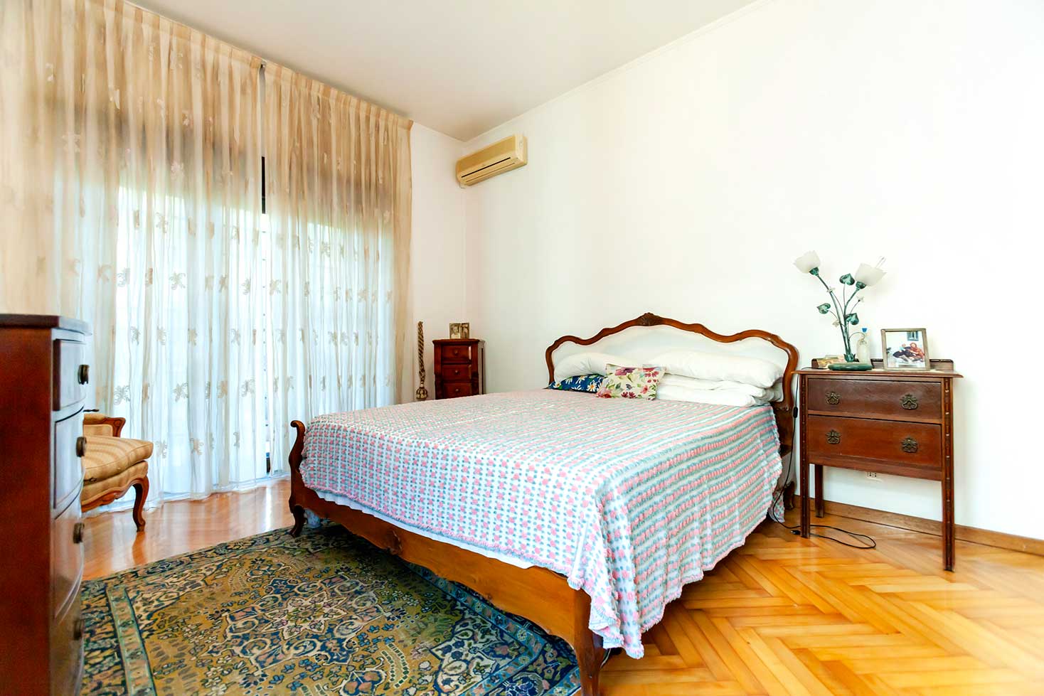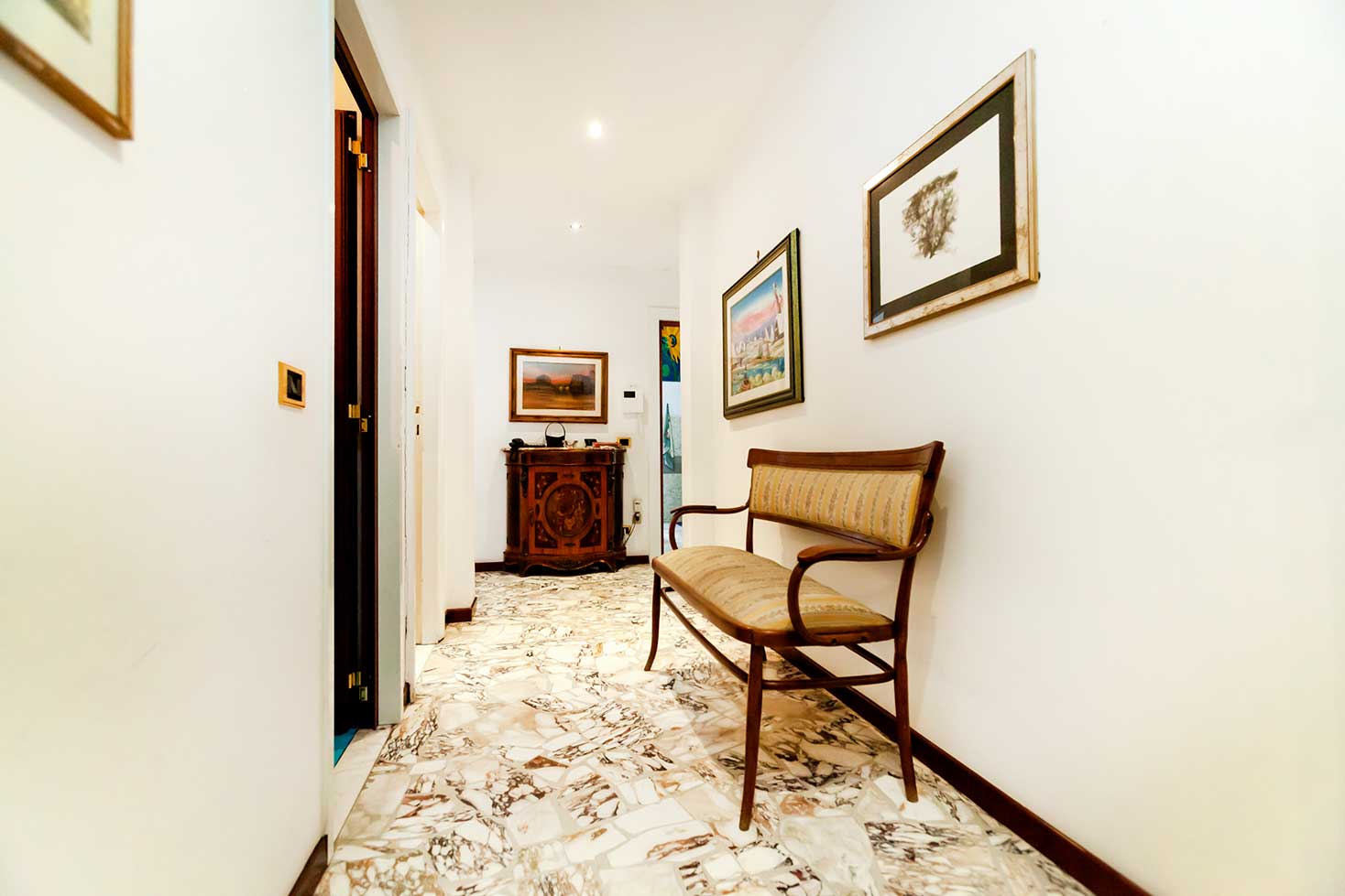 L’abitazione è così composta: Ingresso con salone a vista di ca. 60 mq, tre camere matrimoniali, cameretta, cucina abitabile, due bagni, due balconi di cui uno abitabile ( 12m x2m ) con affaccio aperto su Villa Lazzaroni, ripostiglio.