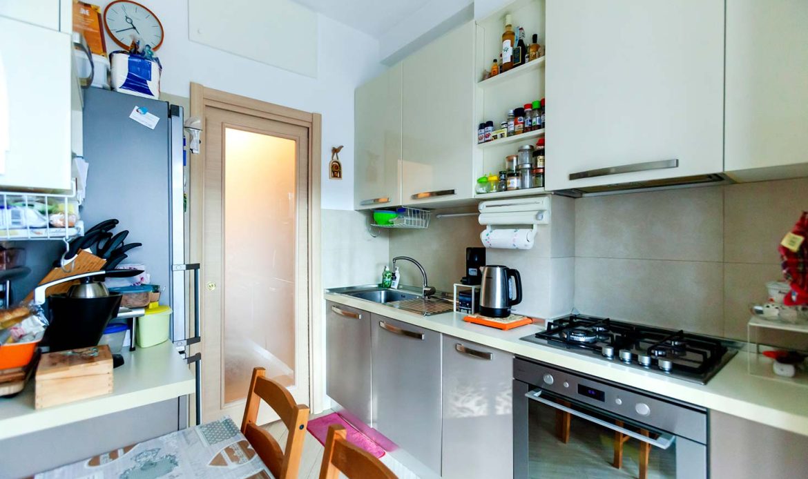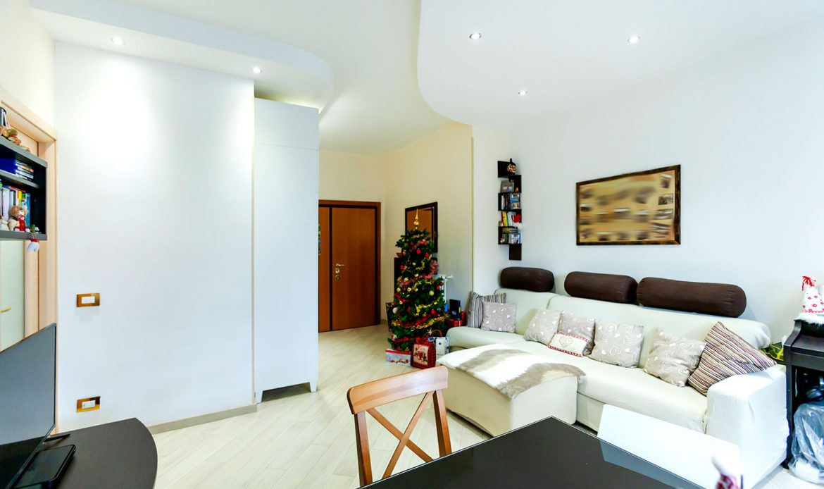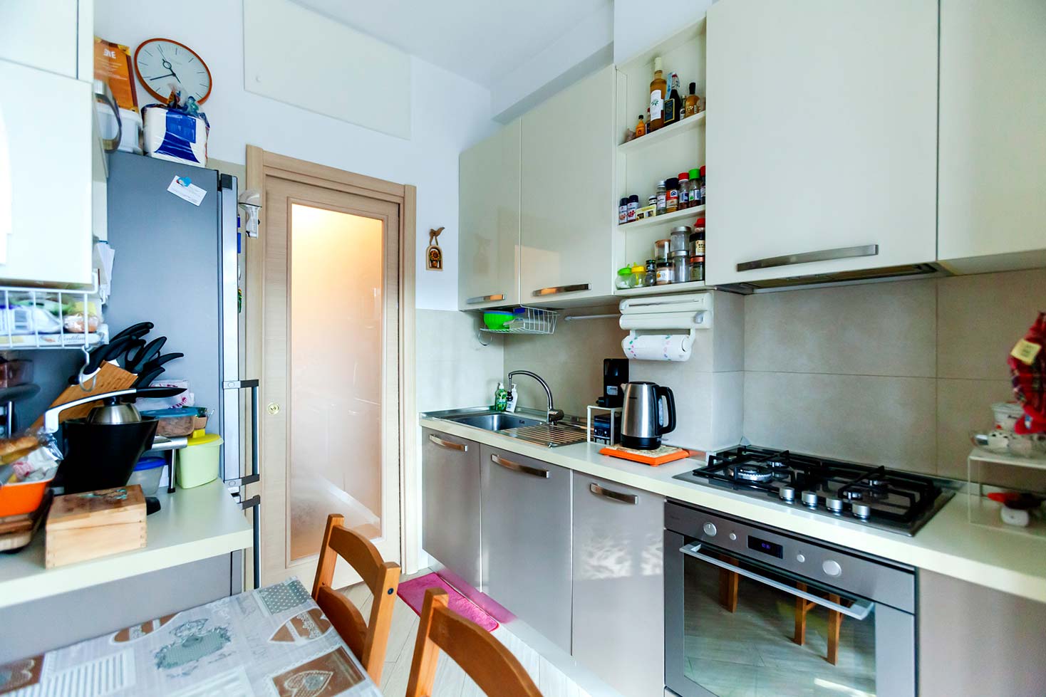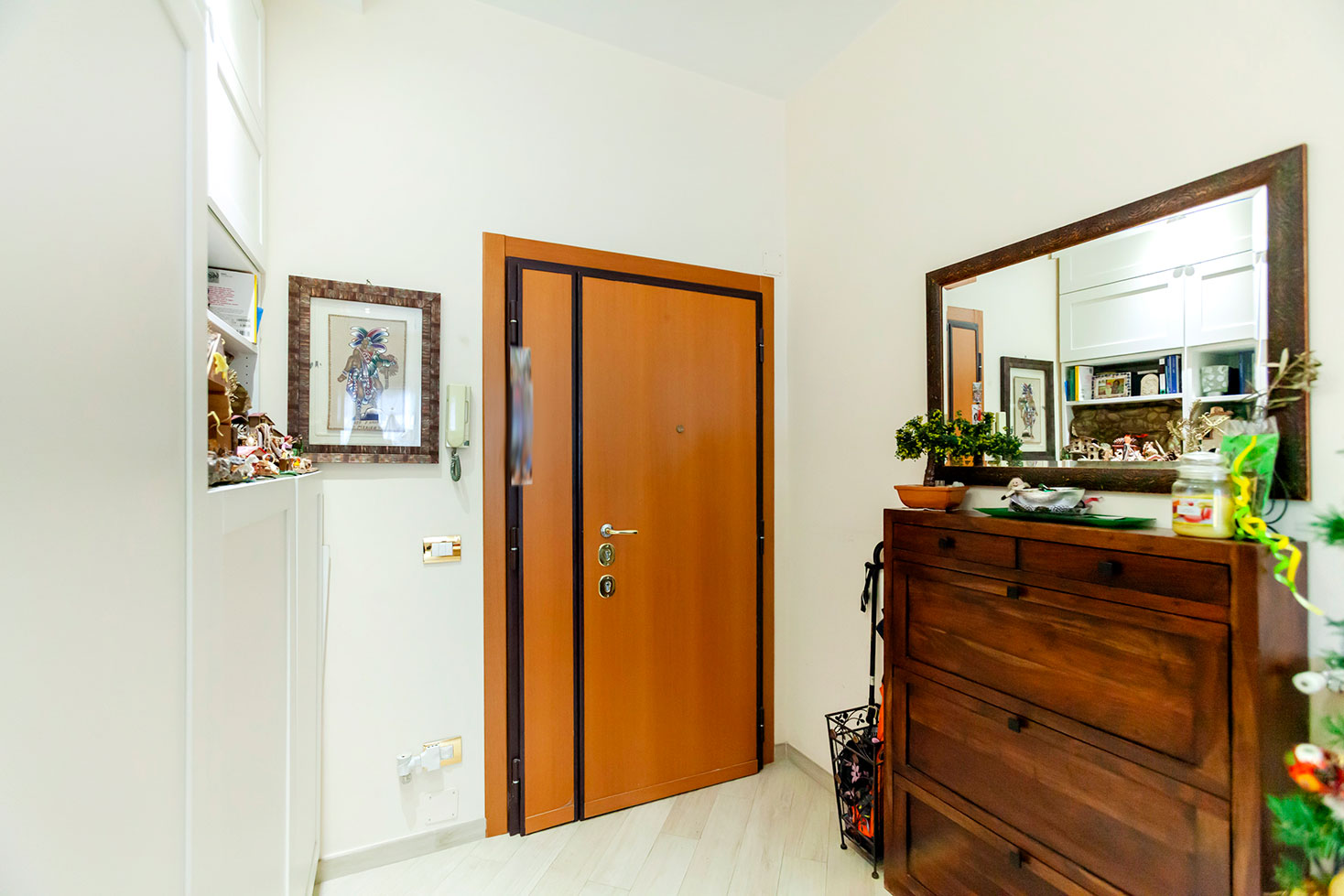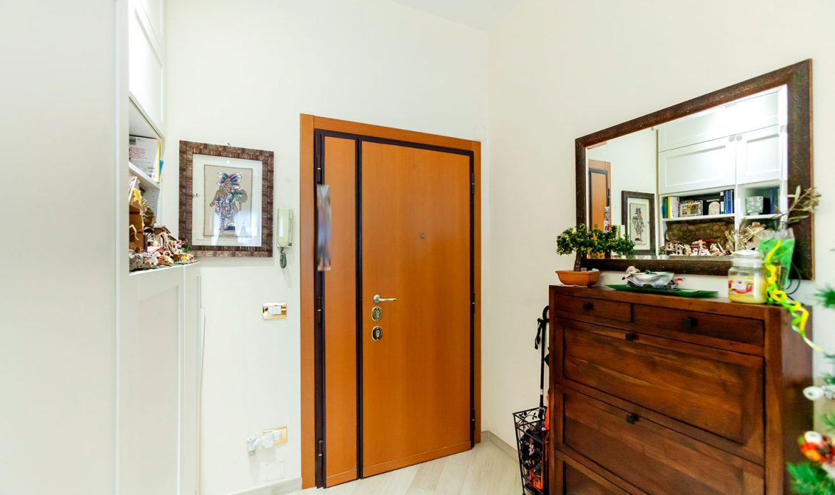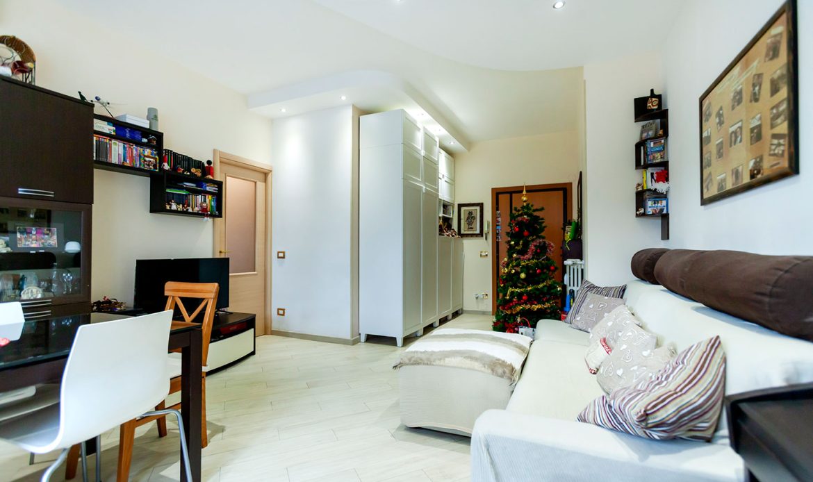 Ingresso con soggiorno a vista, due camere, cucina, due bagni, balcone, cantina al piano seminterrato. La casa è in ottime condizioni, ristrutturata nel 2014 con tutte le certificazioni degli impianti elettrico/idraulico, infissi con doppio vetro, porta blindata, aria condizionata.