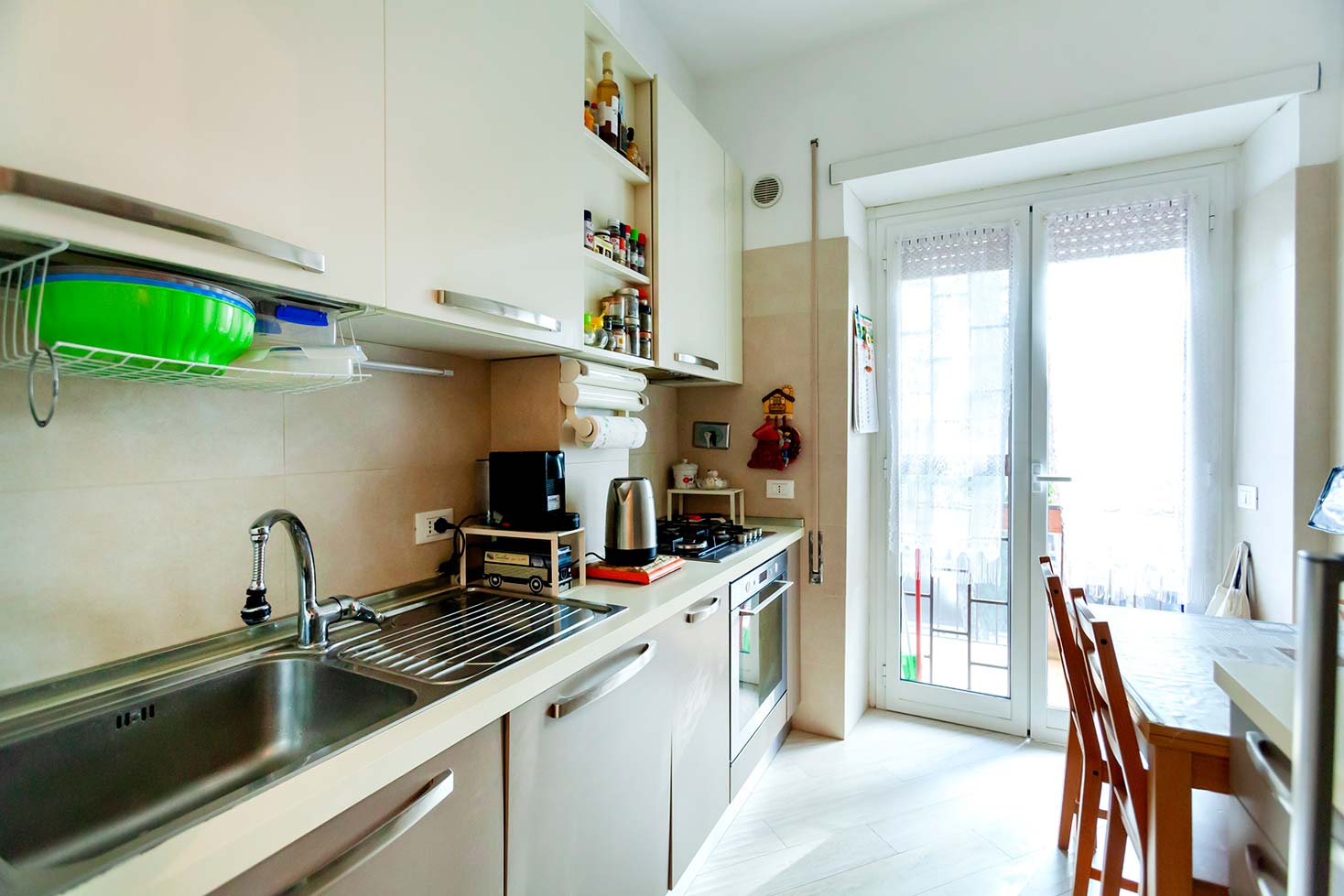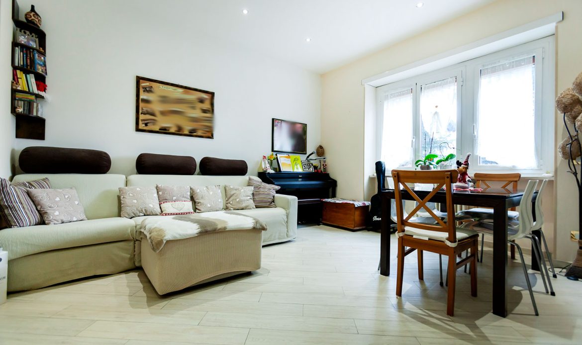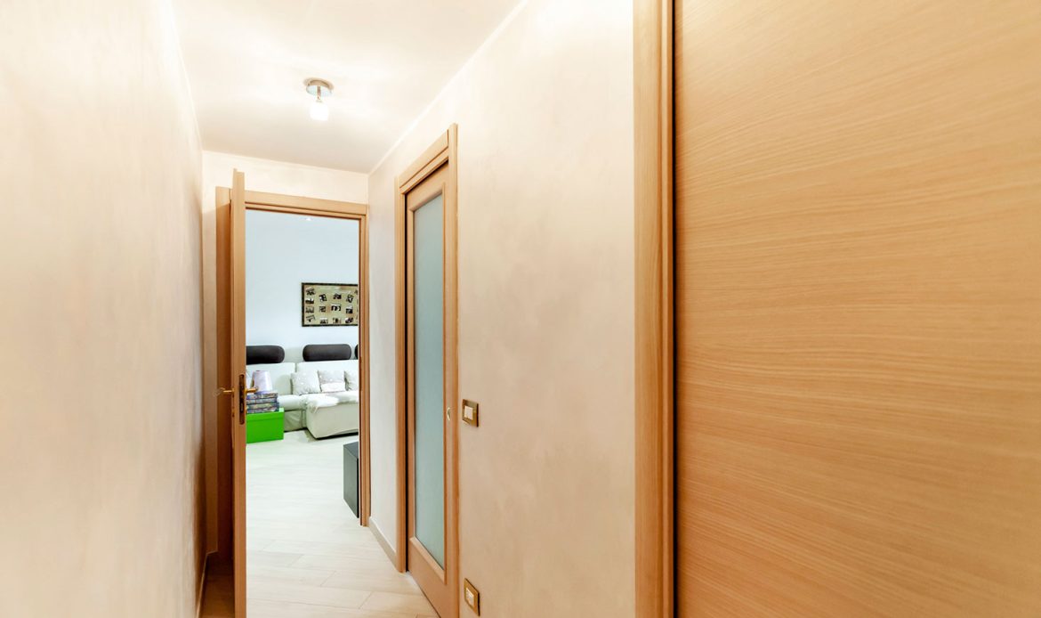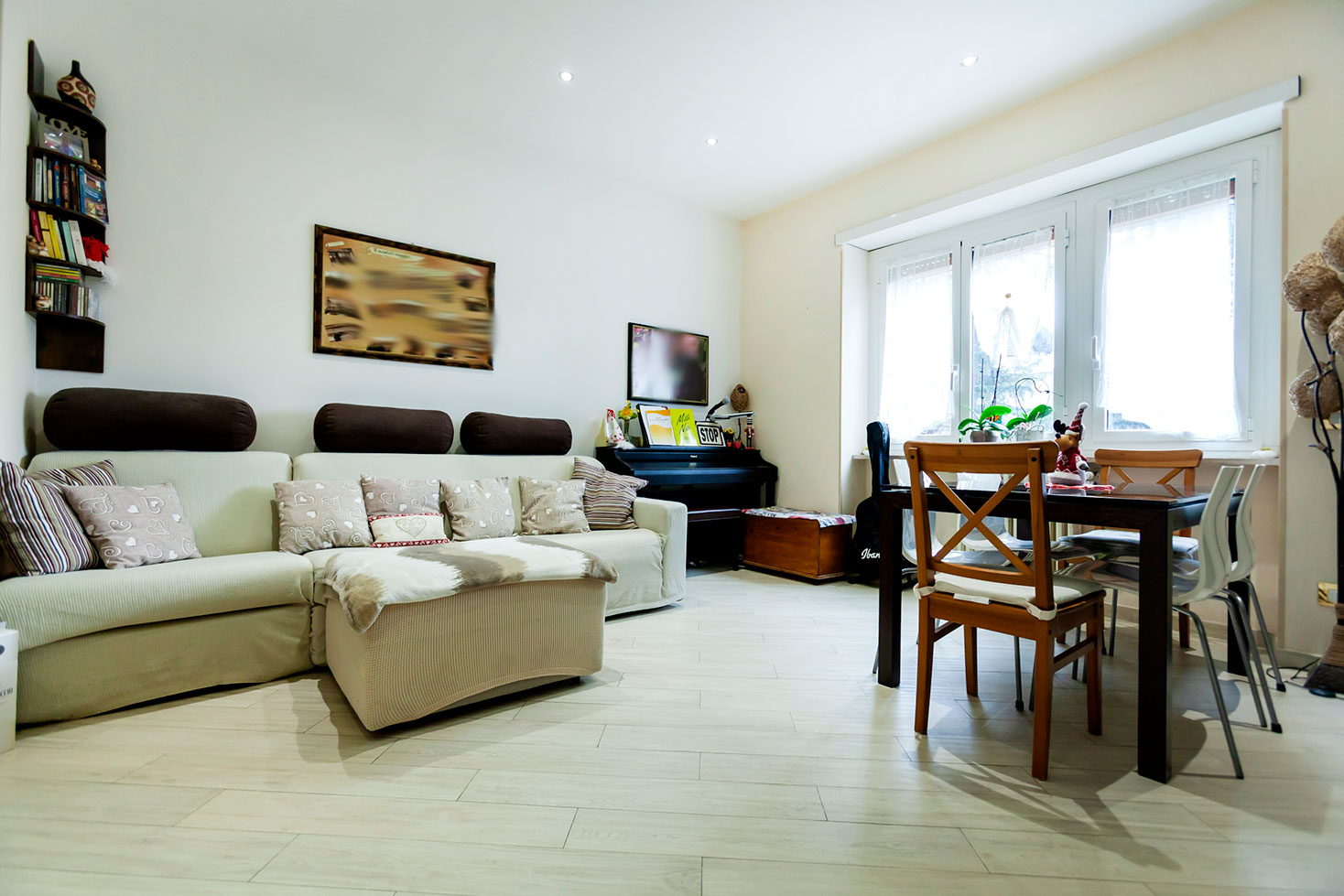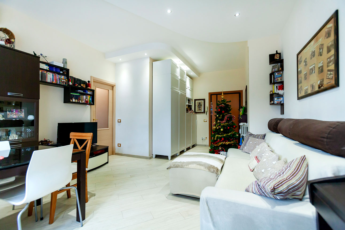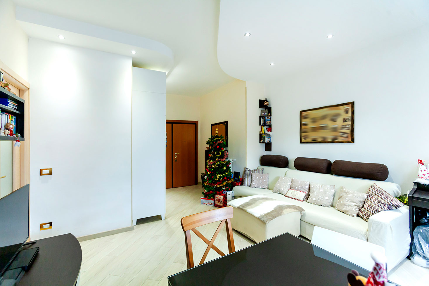 Ingresso con soggiorno a vista, due camere, cucina, due bagni, balcone, cantina al piano seminterrato. La casa è in ottime condizioni, ristrutturata nel 2014 con tutte le certificazioni degli impianti elettrico/idraulico, infissi con doppio vetro, porta blindata, aria condizionata.