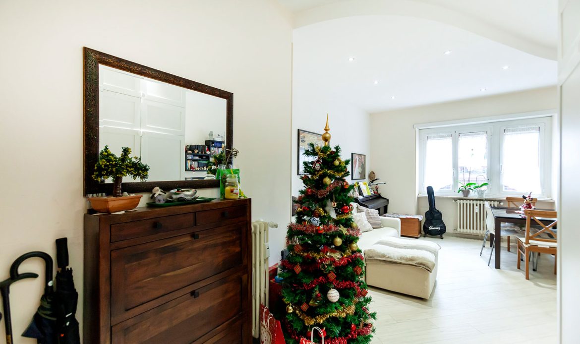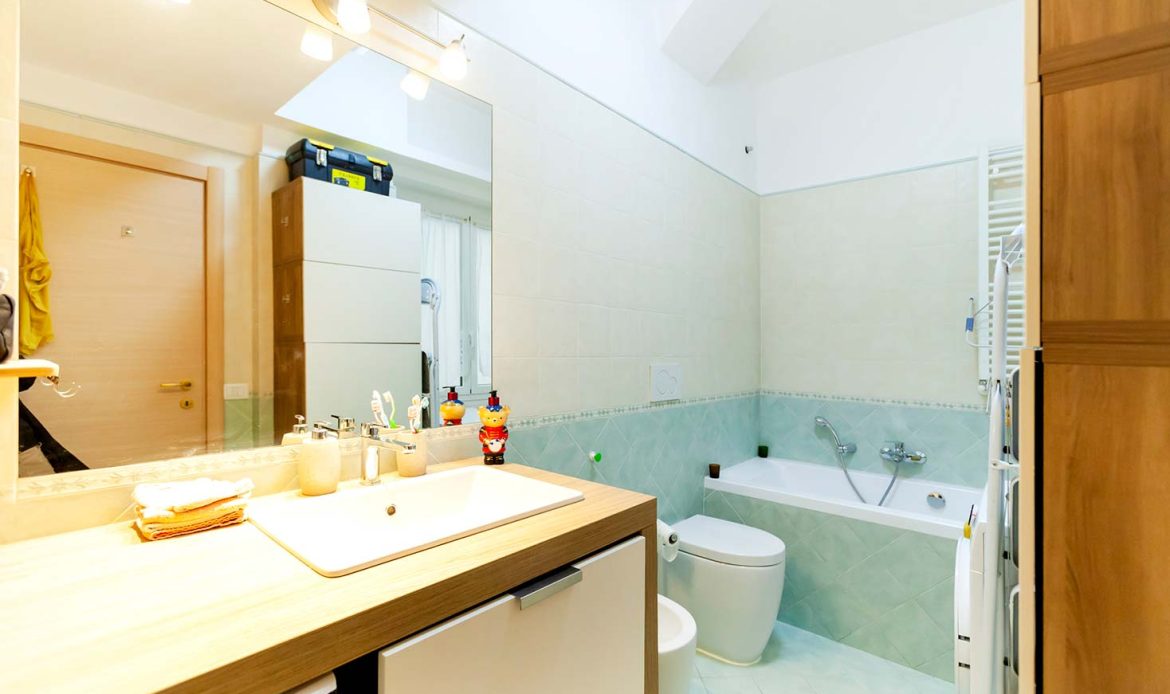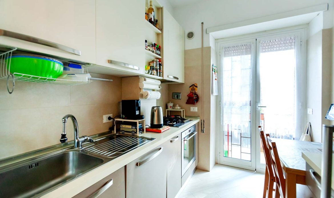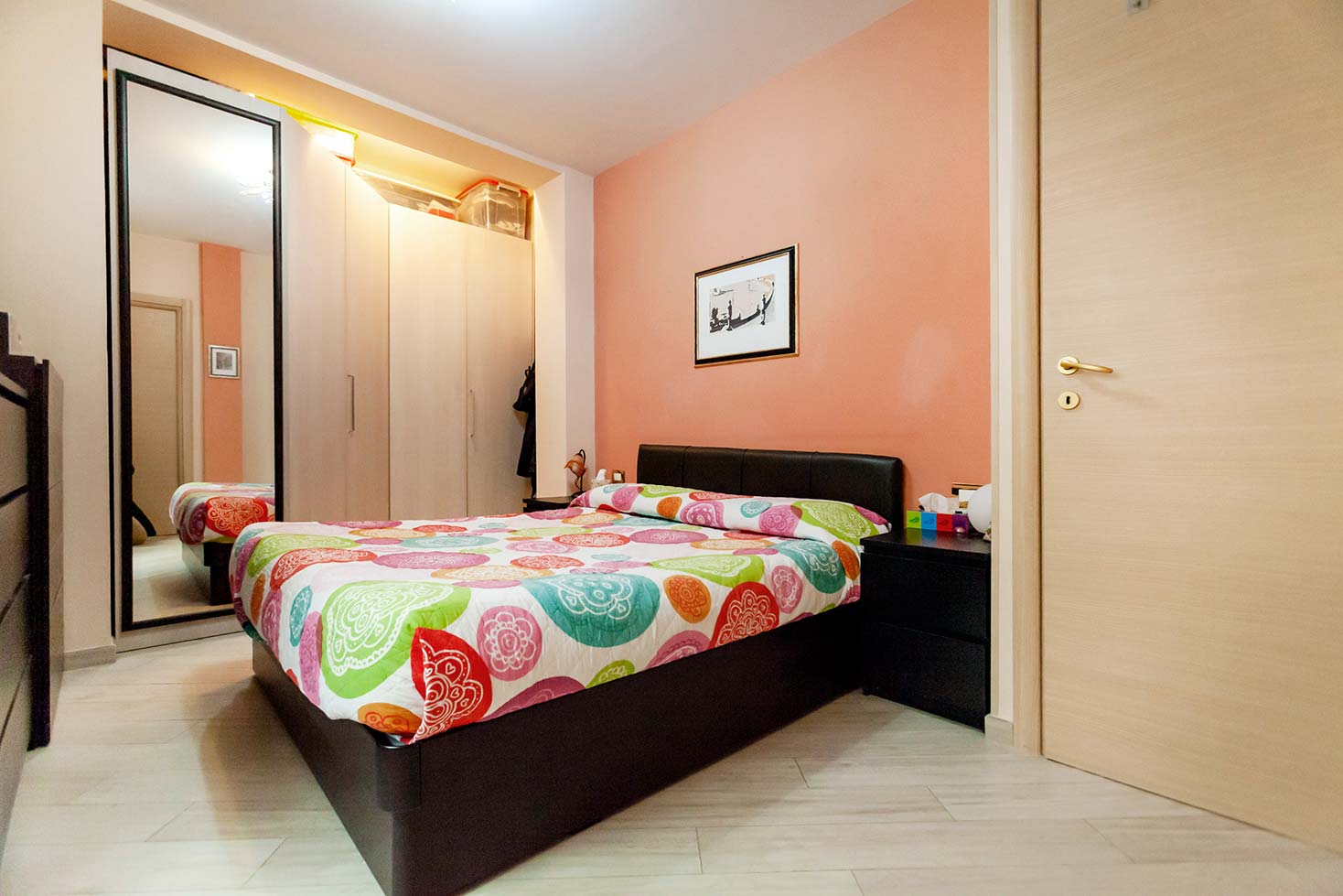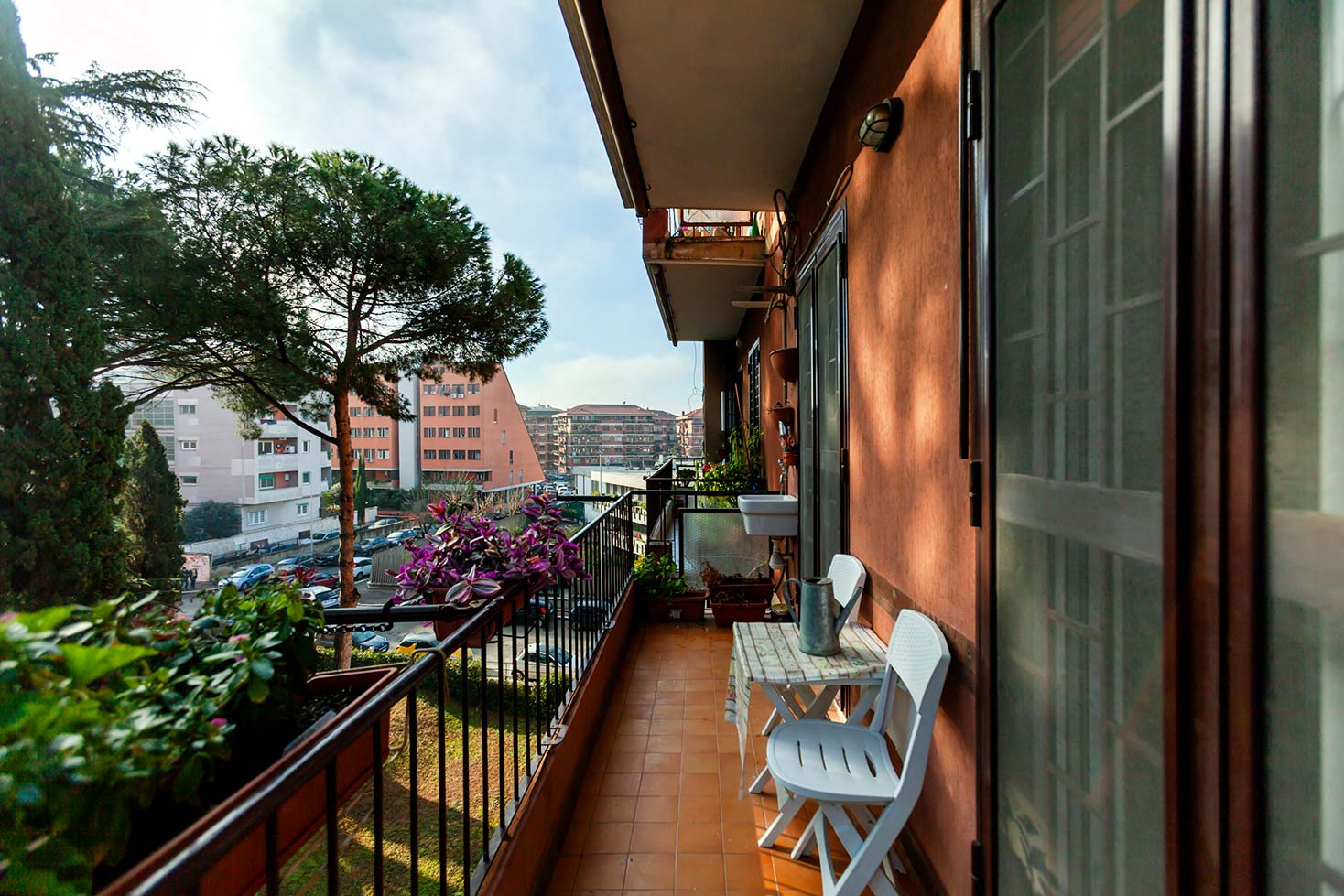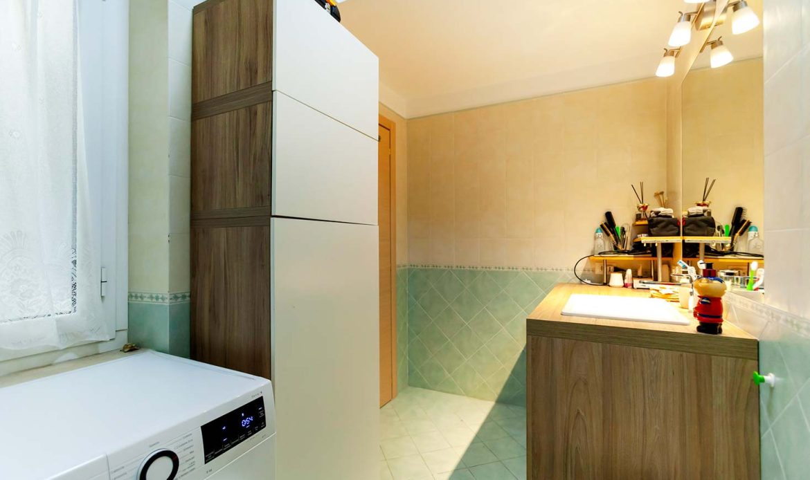Ingresso con soggiorno a vista, due camere, cucina, due bagni, balcone, cantina al piano seminterrato. La casa è in ottime condizioni, ristrutturata nel 2014 con tutte le certificazioni degli impianti elettrico/idraulico, infissi con doppio vetro, porta blindata, aria condizionata.